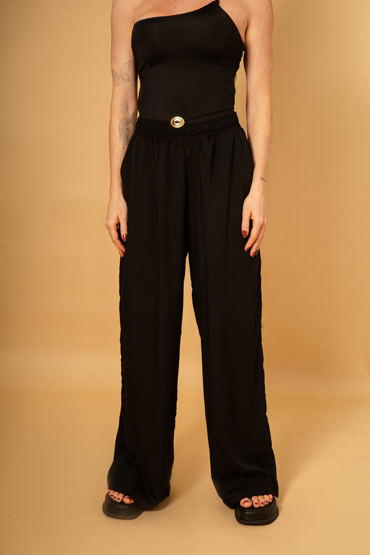 Calça de viscose, estilo pantalona fluída, com elástico no cós e bolsos nas laterais. Modelo veste tamanho M.
