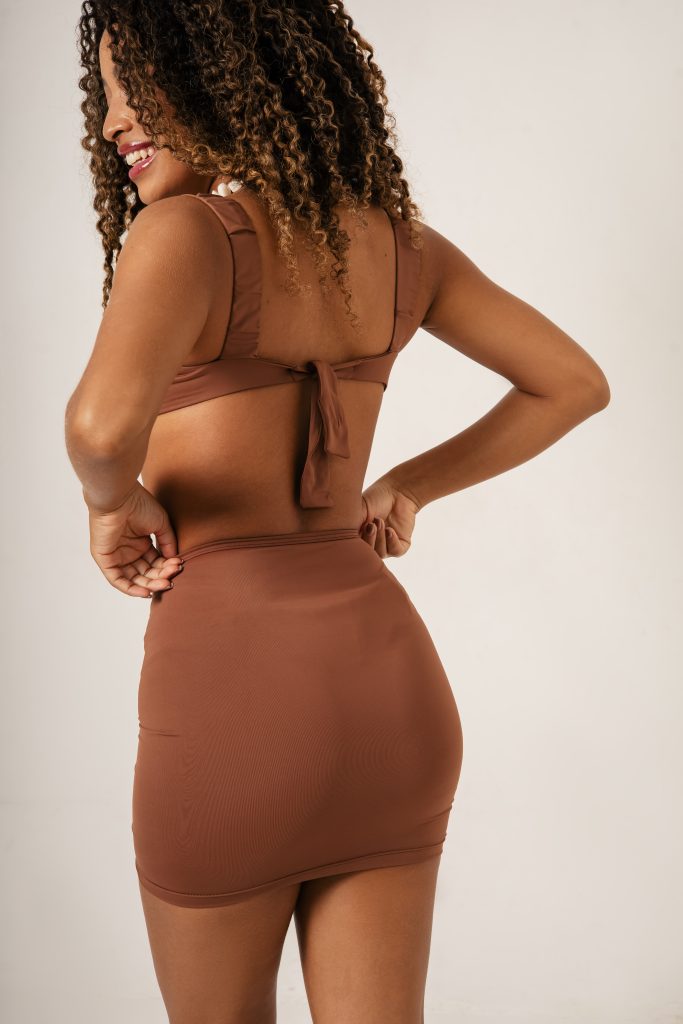 Calcinha cavada com amarração de lacinho nas laterais. Composição 87% poliamida e 13% elastano. Produto com proteção UV. Modelo veste tamanho M.